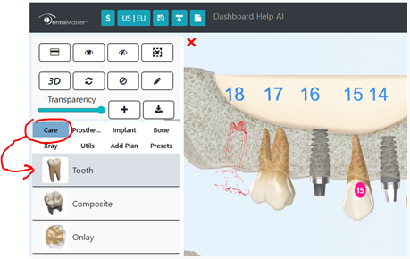 To erase all treatments applied to one or several teeth, select the tooth/teeth and click the “Tooth” icon.