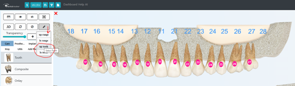 👉 Use the Up Teeth or Lo Teeth icon to select all upper or all lower teeth at once.